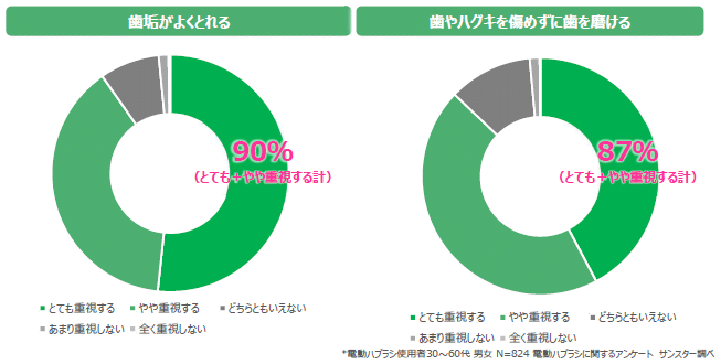 30~60代男女の電動ハブラシ使用者にアンケート調査を実施したところ、購入する際の重視点として「歯垢(プラーク)がよくとれる」(90%)、一方で「歯やハグキを傷めずに歯をみがける」(87%)という結果になりました。(図1)