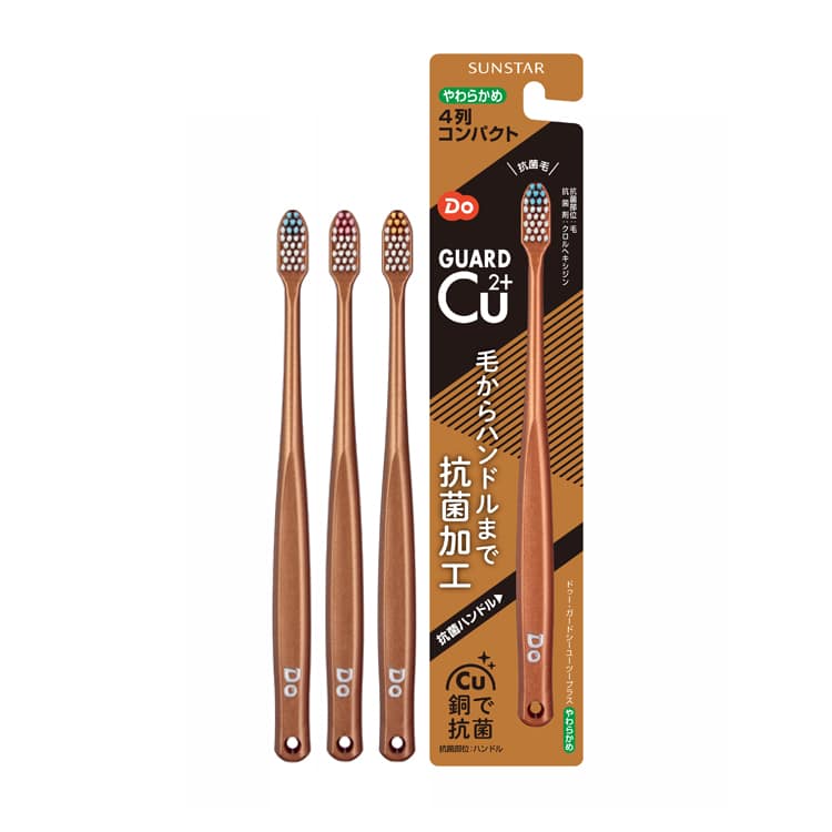 「ドゥー・ガードシーユーツープラス ハブラシ」では、ハブラシの毛に抗菌毛を、毛を植えているハンドルには抗菌作用のある銅を配合したプラスチックを使用しています。これまでも、「Do(ドゥー)」では、抗菌毛のハブラシを販売してきましたが、この度の新製品は、よりハブラシの衛生面に対するニーズにお応えするため、毛からハンドルまで、ハブラシ全体に菌の繁殖を抑える*2抗菌加工素材を採用したハブラシです。
