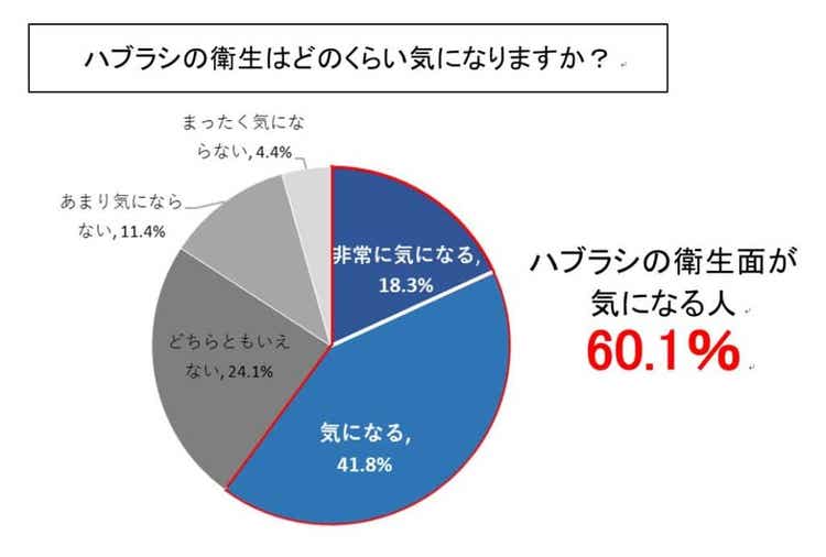 ハブラシの衛生について、「非常に気になる」「気になる」「どちらともいえない」「あまり気にならない」「まったく気にならない」の5段階で評価してもらったところ、「非常に気になる」「気になる」と回答した人の割合は60.1%となりました。内訳は「非常に気になる」が18.3%、「気になる」が41.8%でした。