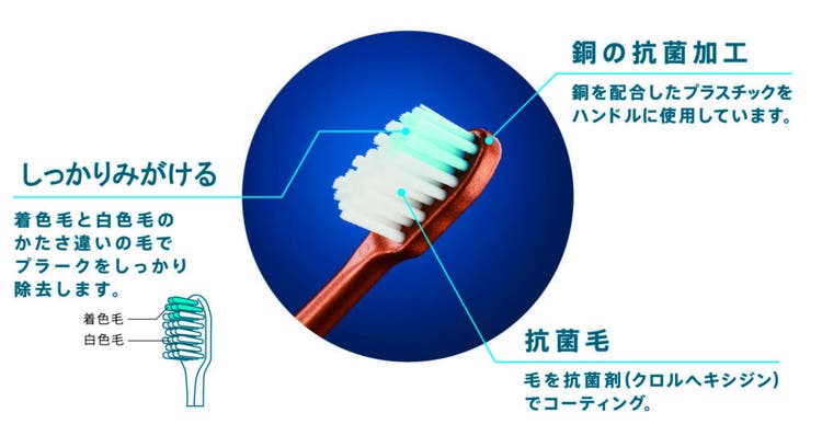 ①ハンドル部分に銅を配合したプラスチック、毛に抗菌剤クロルヘキシジンでコーティングした抗菌毛を採用した、菌の繁殖を抑える抗菌加工のハブラシです。
