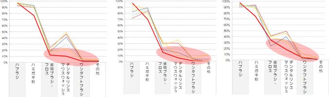 本調査により、日本では自分が歯周病患者の該当者及び該当する可能性があるという意識が非常に高く、また、日本ではオーラルケアのアイテムとして、ハブラシとハミガキペーストのみを使用するケースが多く、デンタルリンスや歯間ブラシなど他のアイテムの普及率の低さが顕著に現れました。