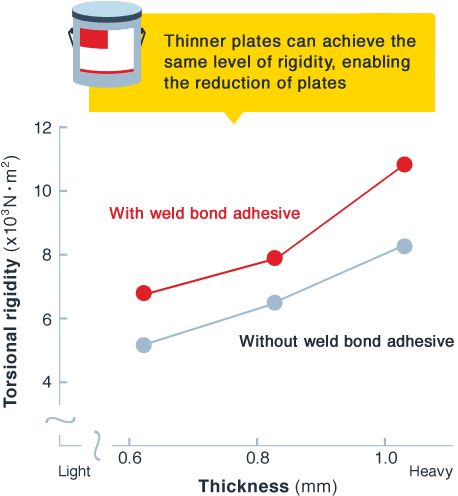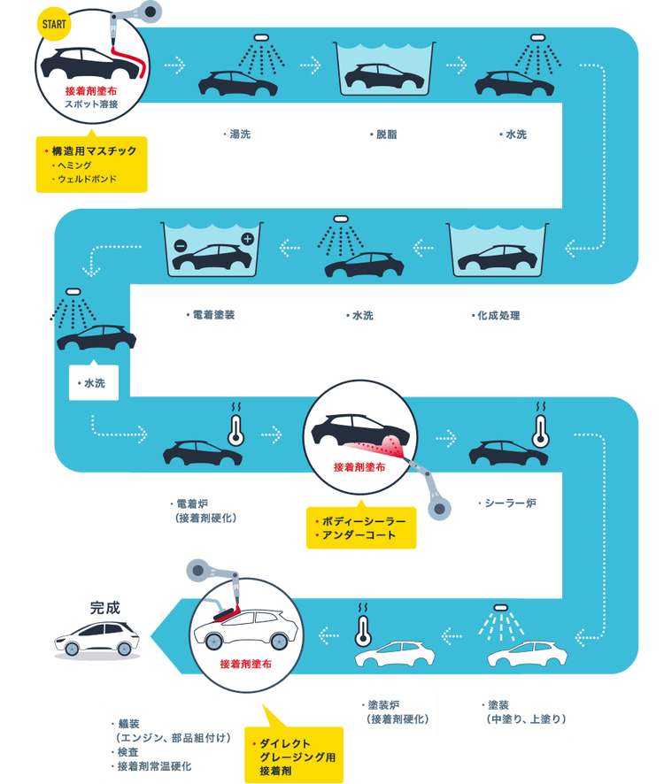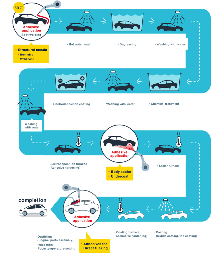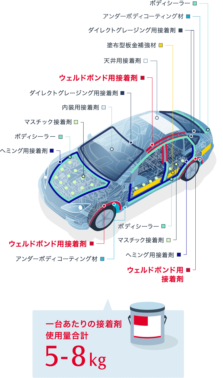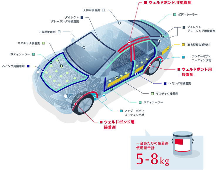 2016年の世界の自動車販売は約 9,000 万台以上で、2010年から7年連続で増加傾向にあります。この巨大市場では世界中で環境負荷物質の低減や燃費向上の為の技術開発が進んでおり、自動車メーカーは車体の軽量化に取り組み、ボディー設計には様々な革新が起きています。その中で、自動車構造材のマルチマテリアル化が起き、鉄鋼からアルミニウムやマグネシウム、有機化合物との複合材等の軽量化素材の比率が増加しています。このような軽量化を目的とした素材の多様化が進む中で、重要な役割を果たすのが自動車用接着剤なのです。