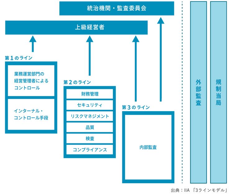GRC部門は、内部監査人協会(IIA)のガイドラインに基づき、次のような「3ラインモデル」に則って活動を行っています: