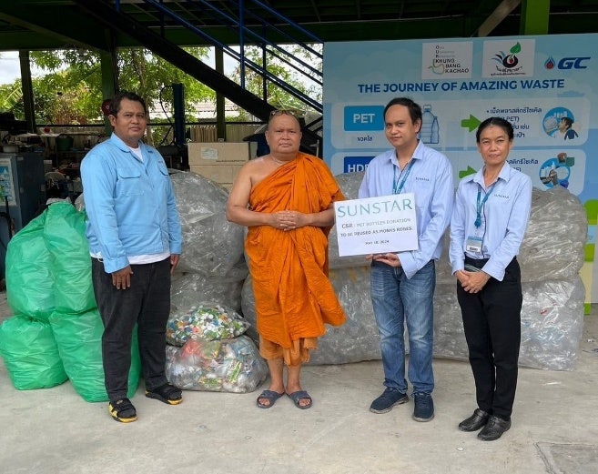 タイでは、「PETボトルの寄付を僧侶の袈裟として再利用する」プロジェクトを通じて、環境保全に関する活動を継続的に行っています。2024年は、PETボトル115kg、プラスチックラベル、PETキャップを回収・寄付しました。PETボトルは、分解されるのに450年かかりますが、寄付することで15本のボトルが僧侶の袈裟1着として生まれ変わります。