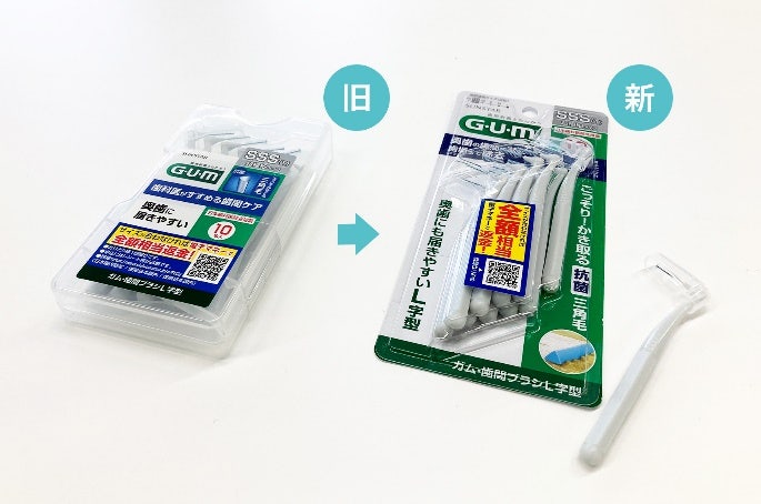 お客様からの環境配慮へのご要望をもとに、プラスチックケースに入れて販売してきた歯間ブラシの包装材を、紙の台紙と透明カバーの包装に変更しました。これにより包装材のプラスチック使用量を約80%削減。透明カバーには再生プラスチックを、台紙には森林認証紙を使用、歯間ブラシのハンドルには植物由来原料のバイオマスプラスチックを配合し、環境負荷低減に努めました。