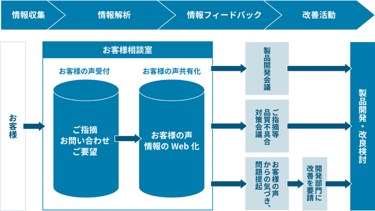 お客様からのお申し出は、翌日には社内Webで情報共有し、前日のお客様の声情報のみならず、お客様の声の全体傾向や製品別傾向も共有化しています。また、お客様の声は製品開発会議等で共有し、製品開発にフィードバックしています。