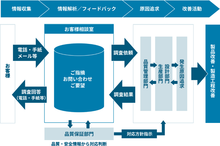 上記の方針に則り、1)お客様からいただいたお申し出に誠意をもって迅速に対応する、2)お客様からのご指摘は、社内の関連部門と連携して原因を調査し、製品や製造工程の改善に役立てることを徹底し、お客様満足度の向上に努めています。