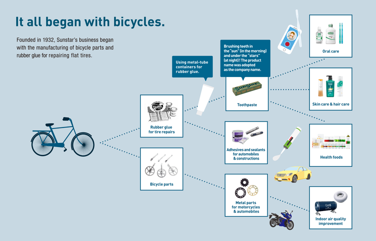 Sunstar traces its origins to “Kaneda Keitei Shokai,” a private wholesaler of bicycle parts established in Osaka in 1932 by founder Kunio Kaneda, who was born in a small village surrounded by sea and mountains in Hiroshima Prefecture. He had his sights set on the bicycle industry, which was rapidly booming as a new industry. The company’s first hit product was rubber glue for fixing punctured tires. Previously, rubber glue had been sold in large cans; Kaneda’s innovation was to package it in small metal tubes for easier use. He then used the same production facilities to create metal tubes filled with toothpaste, his next success. At a time when toothpaste was still predominantly sold in powder form, Kaneda developed and commercialized processing methods for his tubed toothpaste from scratch, and it was praised for its ease of use, its quality, and its’ refreshing flavor. The company rapidly grew its oral care business to include toothbrushes in addition to toothpaste, then expanded into other sectors such as cosmetics and health foods.