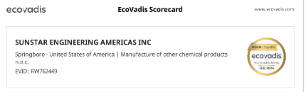 In the 2024 EcoVadis assessment, Sunstar Engineering Americas Inc. has successfully maintained its Gold Medal status, confirming its position in the top 5% of rated companies globally. In 2025, Sunstar Engineering Europe GmbH also won the Silver Medal, among the top 15% of companies. These achievements reflect our ongoing commitment to responsible business practices across Environment, Labor & Human Rights, Ethics, and Sustainable Procurement.