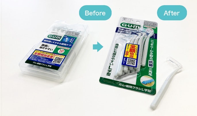 In response to increasing environmentally conscious demands from our customers, we have replaced the packaging of our interdental brushes, which we previously sold in plastic cases, with paper mounts and clear covers. This has achieved an 80% reduction of plastic usage in packaging. By using recycled plastic in the clear cover and FSC® certified paper and incorporating bio-mass plastic derived from plant sources in the handle of our interdental brushes, we have reduced the environmental impact of our product.